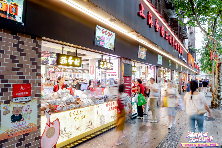 当历史悠久的糕点铺、金银饰品店被注入热血元素、古老言灵和治愈能量等不同元素时,淮海路焕发出前所未有的活力。老字号牵手不同的IP,不仅为原有特色商品增添IP主题等创意包装,打造出令人眼前一亮的“破圈好礼”,还联动门店将打卡互动与消费折扣有机结合,全面提升文旅商多元业态融合吸引力。许多“首进淮海路”的新粉丝,正是被这波二次元热浪吸引,一边打卡一边深度体验中华传统文化,催生出浓浓团圆烟火气交织着数字潮流的奇特氛围。