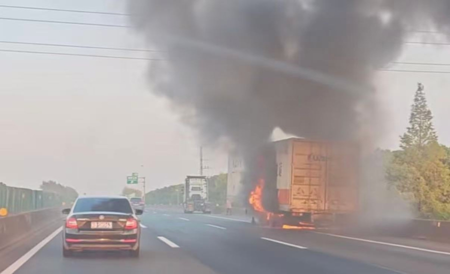 目击市民介绍,当时有一辆半挂货车停在最右侧的应急车道上,车辆货箱后轮处不断有明火蹿出。半挂车驾驶员发现情况后,立即将车头和货箱分离,并将车头停至前方约50米处。随后驾驶员拨打报警电话。
